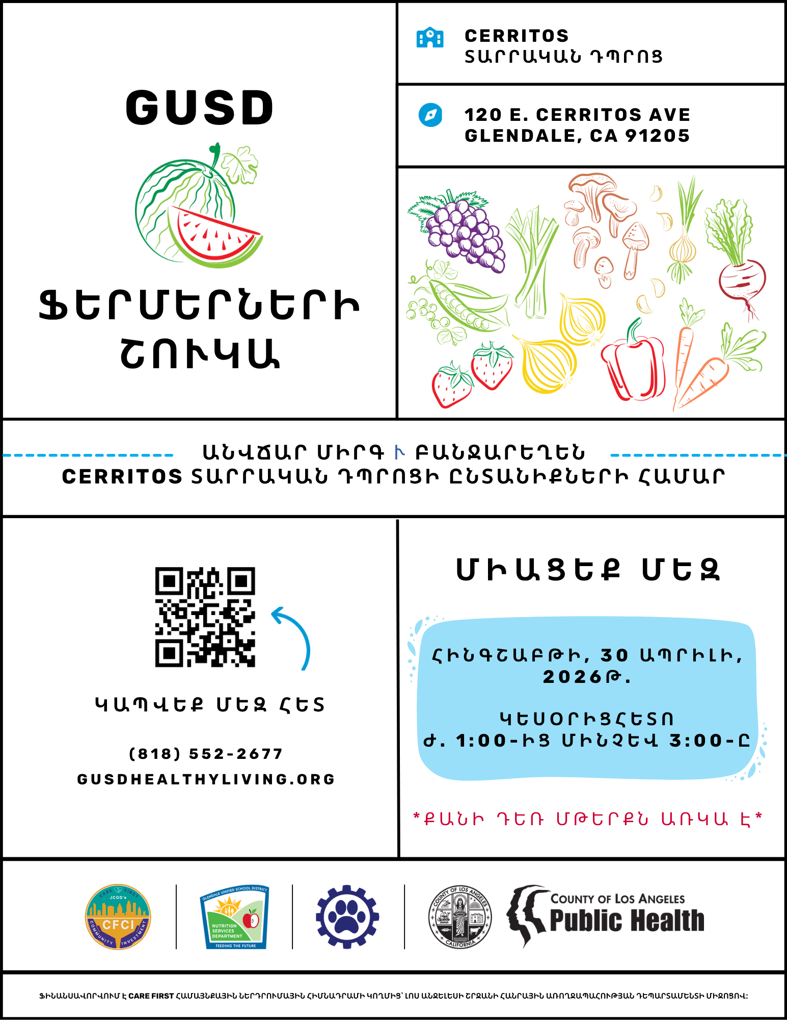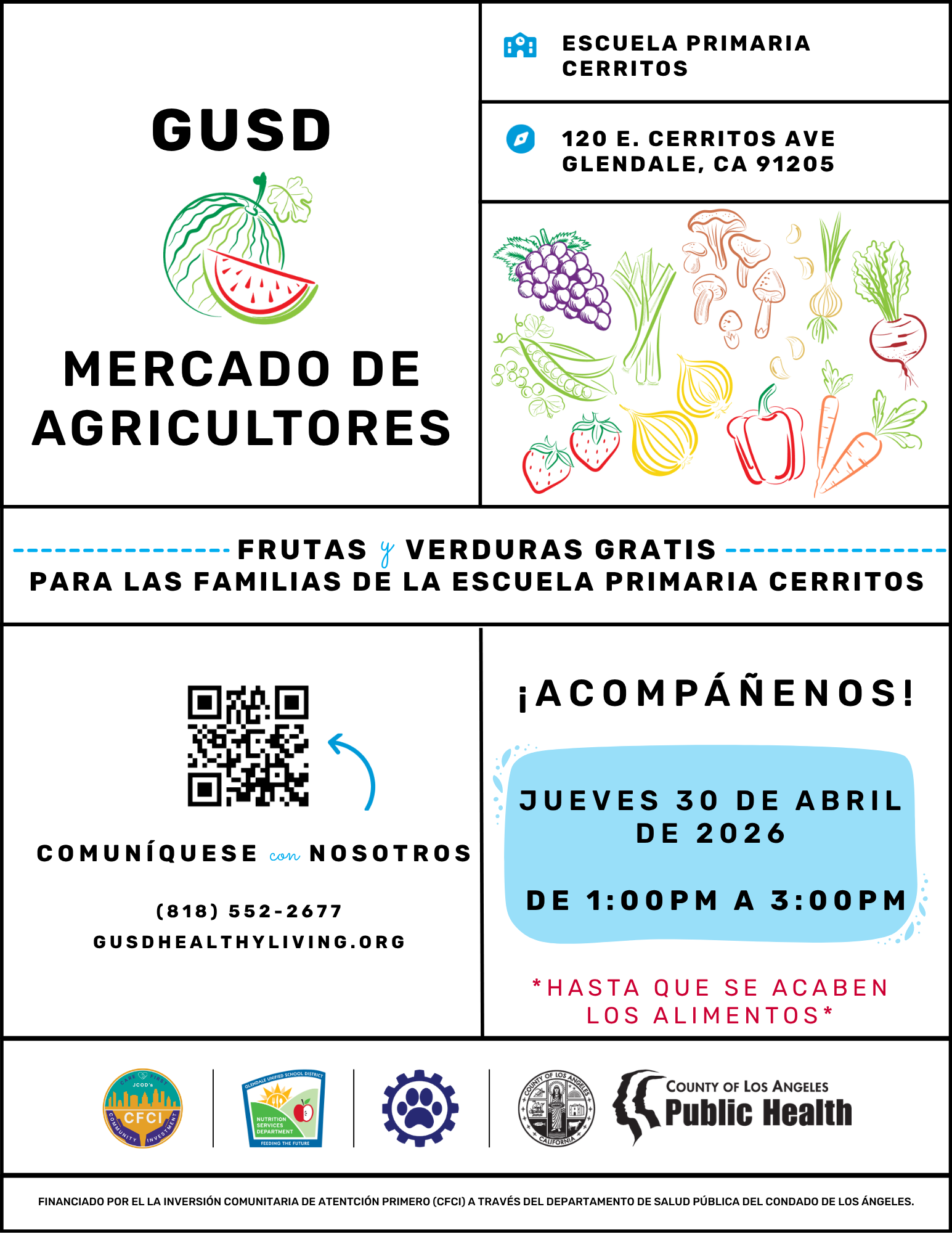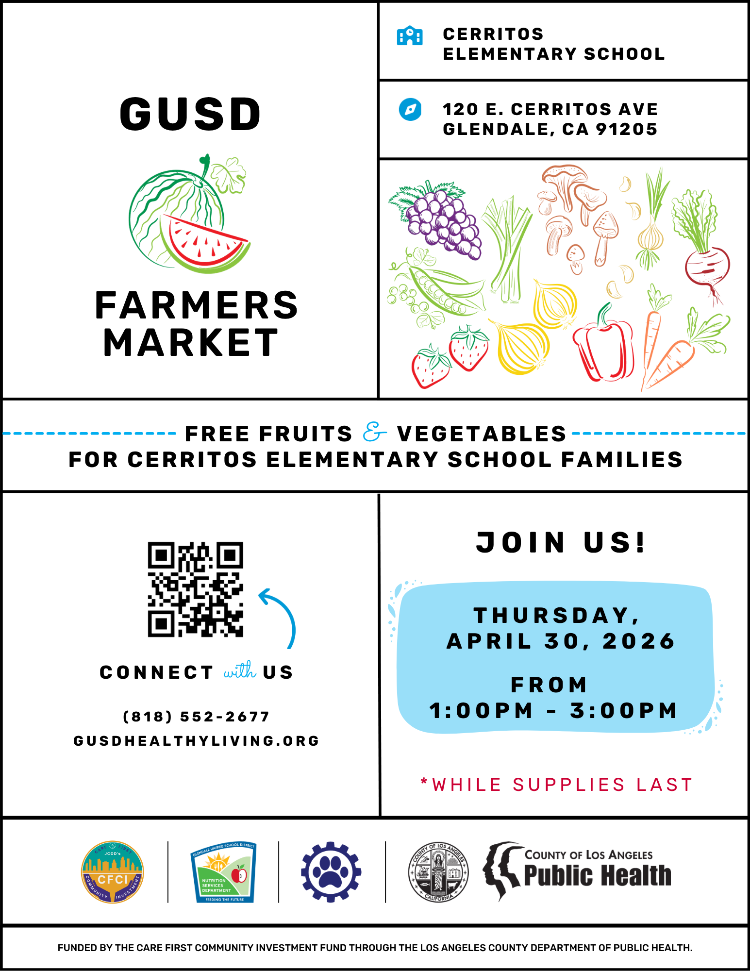 Stop by our farmers market style produce distribution event for a great selection of free fruits and vegetables, food access resources, and community partners sharing information about their local services. This event will take place in the grassy area in front of the school.