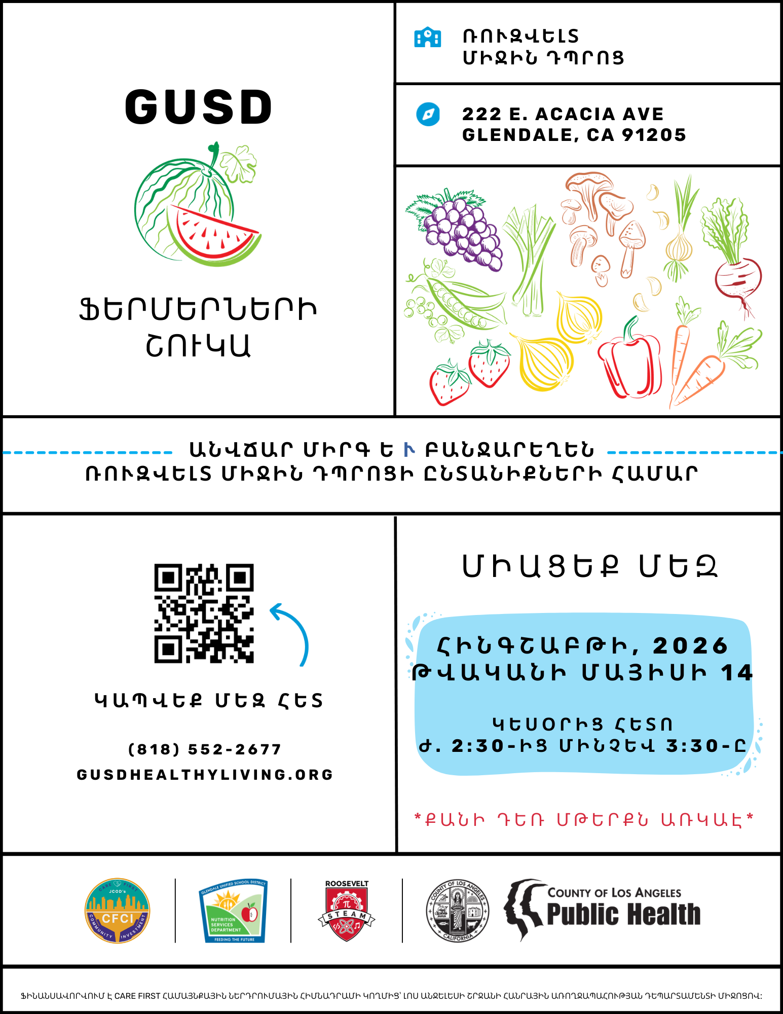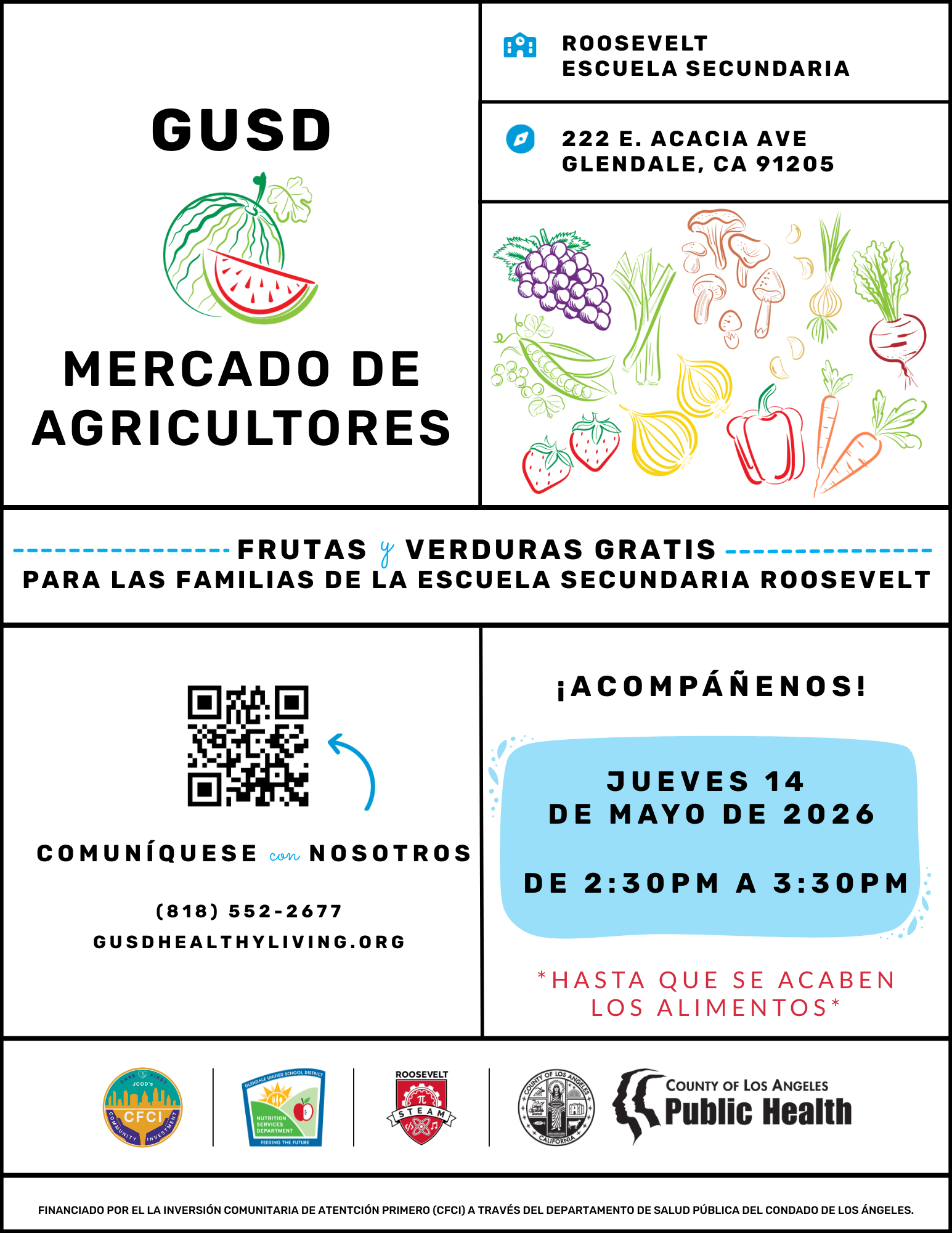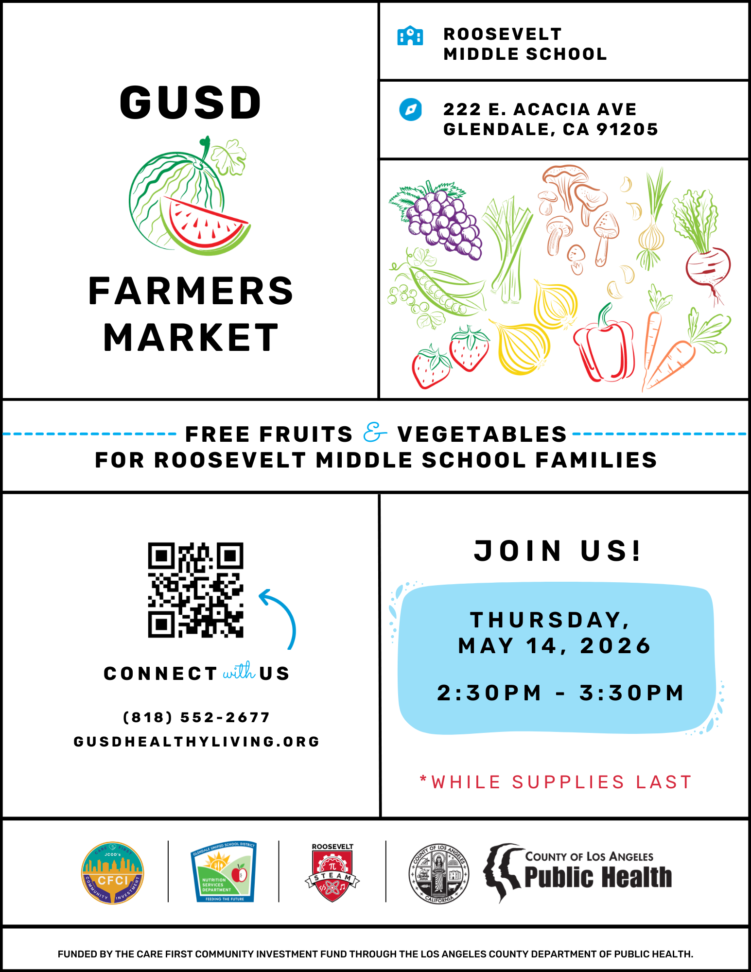 Stop by our farmers market style produce distribution event for a great selection of free fruits and vegetables, healthy recipe cards, and other nutrition resources. This event will take place in the grassy area in front of Roosevelt Middle School near the corner of E. Acacia Ave. and S. Glendale Ave.